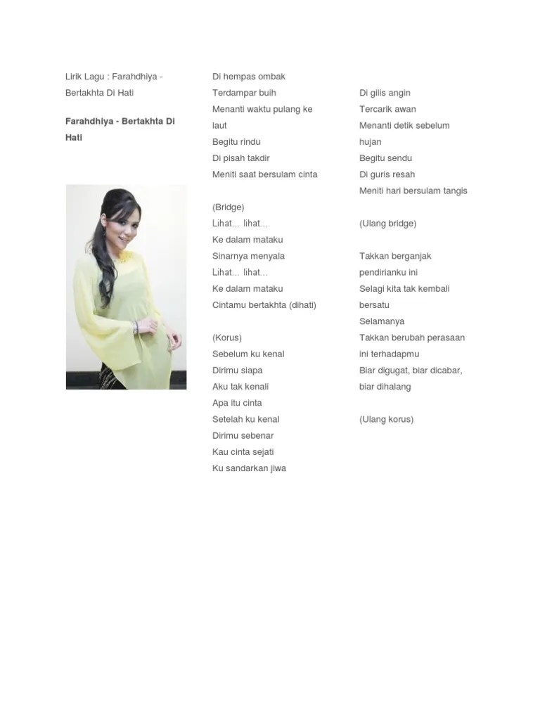 Farahdhiya Bertakhta Di Hati Lirik / Sandra Dianne Jelaskan Listen With Lyrics Deezer. Lagu ni pun mcm legend nk banding dgn lagu2 mcm awk kt mana tu. Cintamu bertahta (di hati) sebelum ku kenal. Kenapa lagu2 sekarang dah x mcm dulu.?